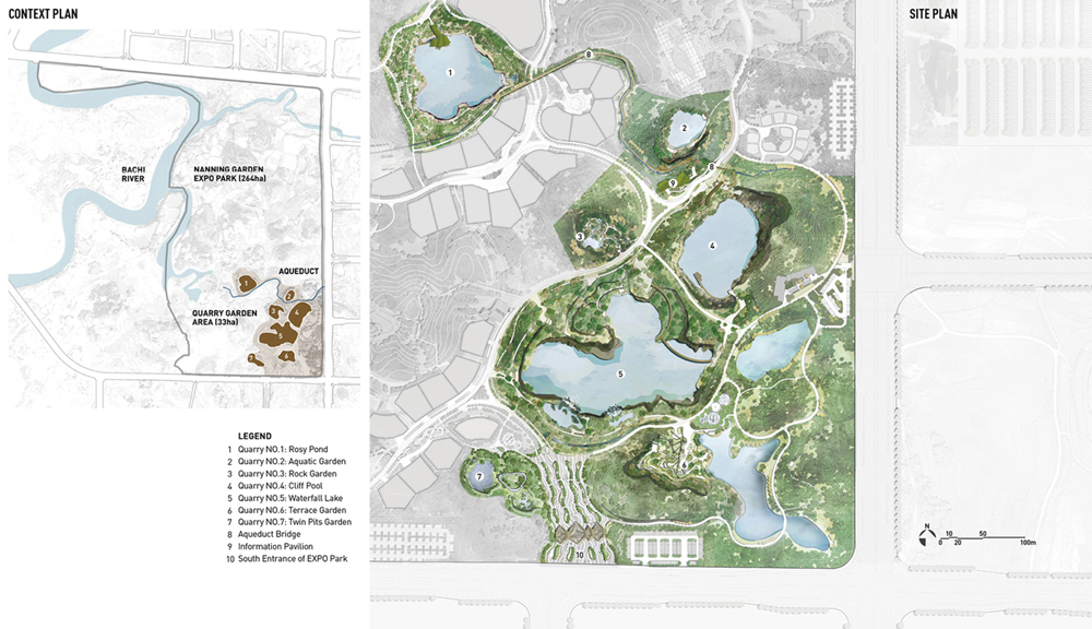 2018年中国国际园林博览会在南宁市举办。园博园选址于城市郊区的一片滨河的丘陵农业区,但场地东南区域分布着一系列的采石场。组委会希望将这些采石场转变为园林博览会中的有特色的园林,成为展览的一部分。