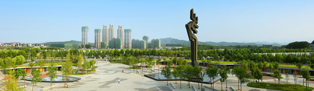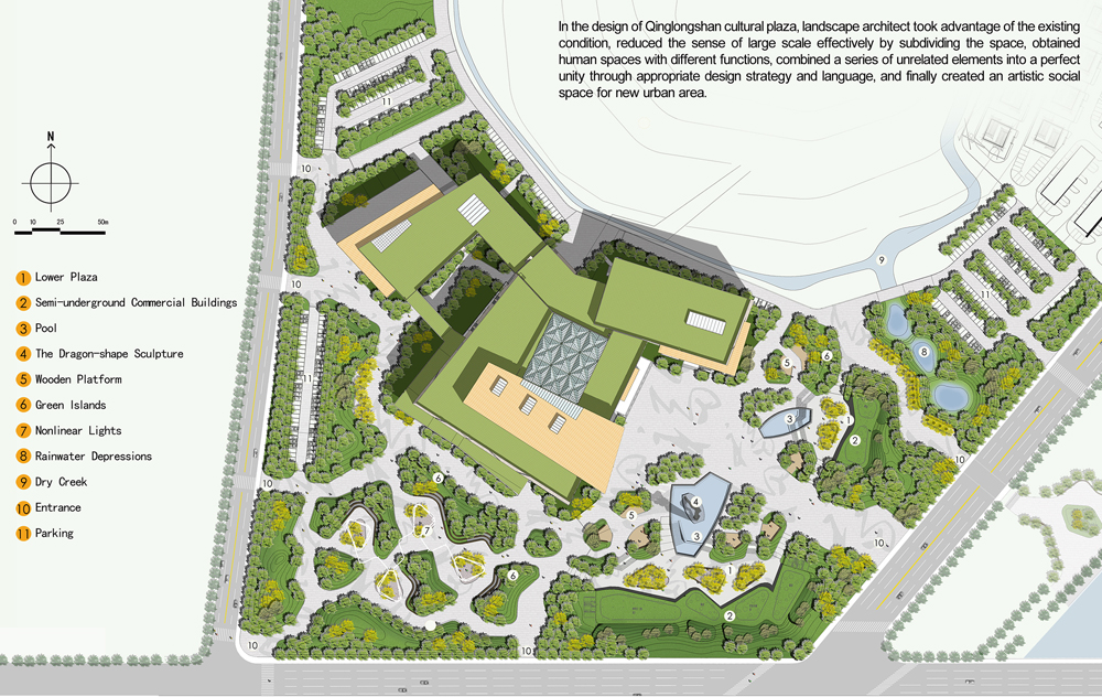 青龙山文化广场的设计中,景观设计师利用场地现有条件,通过对空间的层层划分有效地减小了场地的尺度感,获得不同功能的人性化空间;运用恰当的设计策略和设计语言,将一系列看似毫不相关的要素联系成一个浑然天成的充满艺术气息的整体;通过创造社会化的场所,为未来新城的居民提供生活的舞台。