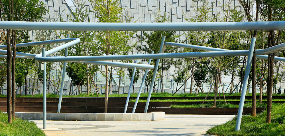 Inspired by the museum’s exhibition theme - oracle bone inscriptions, the designer extracted form language from the ancient Chinese character, and created most landscape elements such as buildings, green islands, benches, lighting, and so on, and used the character as patterns of plaza pavement. This abstract and organic form was well coordinated with the irregular site.