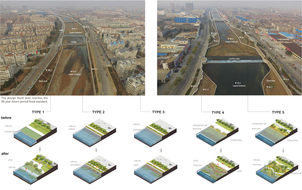 As an important water source of Zhaoyuan city, Jinquan River originates from the southern mountainous area, meanders through the city, and flows into the northwest bay. Due to the monsoon climate, this area has heavy rainfall in summer and dry climate in autumn and winter. Therefore, the Jinquan River, which has a small watershed area and short flow, often faces the floods in rainy season and the droughts in dry season. The water level changes greatly throughout the year and cannot provide a stable water source for the city. In order to solve these problems, a reservoir on the upstream of the river was built to regulate the flow of water and to ensure the water supply; 8-level rubber dams was built in the urban river channel to dam water in ordinary time and to discharge water when the flood comes; Embankments of two levels were constructed on both sides of the river to guarantee the safety of flood discharging during the rainy season. Although these water conservancy projects ensured the city's hydrological safety, it completely changed the natural river and greatly affected the urban landscape. Some parks were built in the waterfront, but they were scattered, lacking facilities, without vitality, and did little help to change the rigid engineering features of the waterfront.